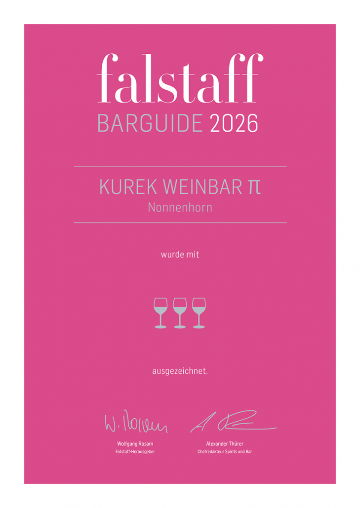 Auch unsere Weinbar wurde im falstaff Barguide 2026 mit drei von vier möglichen Weingläsern ausgezeichnet, mit erreichten 91 Punkten.